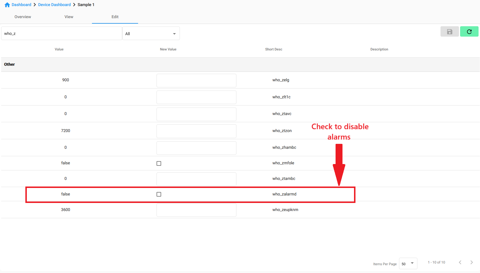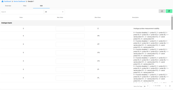 Entering a value into the 'New Value' field will allow you to assign a new value to the parameter. Doing so will also highlight the field in green if it is a valid value. The save button will allow you to save this value once complete. Multiple fields can be edited simultaneously.