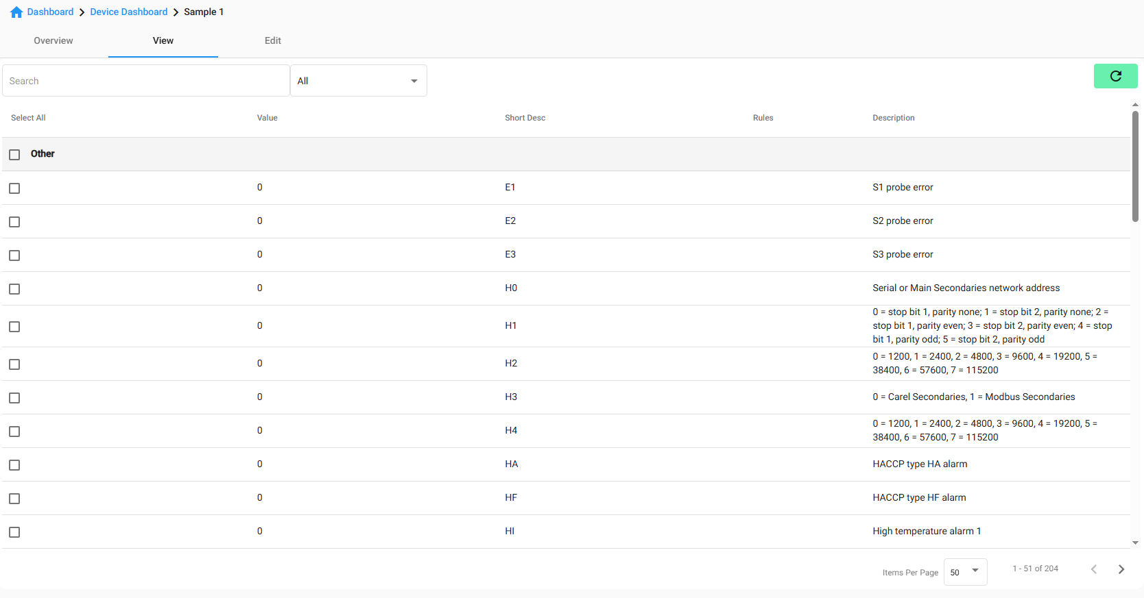 The View tab contains read-only parameters displayed within a table. The table displays read-only parameter values, short code and descriptions. These are grouped and displayed by parameter type.