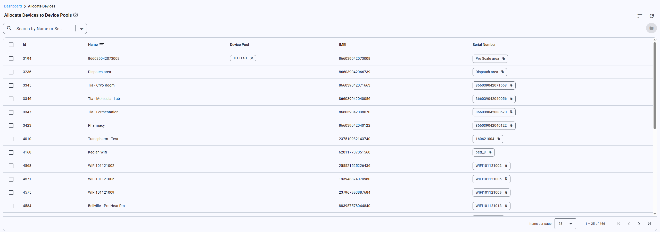 The Device Pool Management Page allows users to view, search, filter, select, and manage devices within the device pool. From this page, users can assign actions to multiple devices, manage device pools, and easily copy device serial numbers.