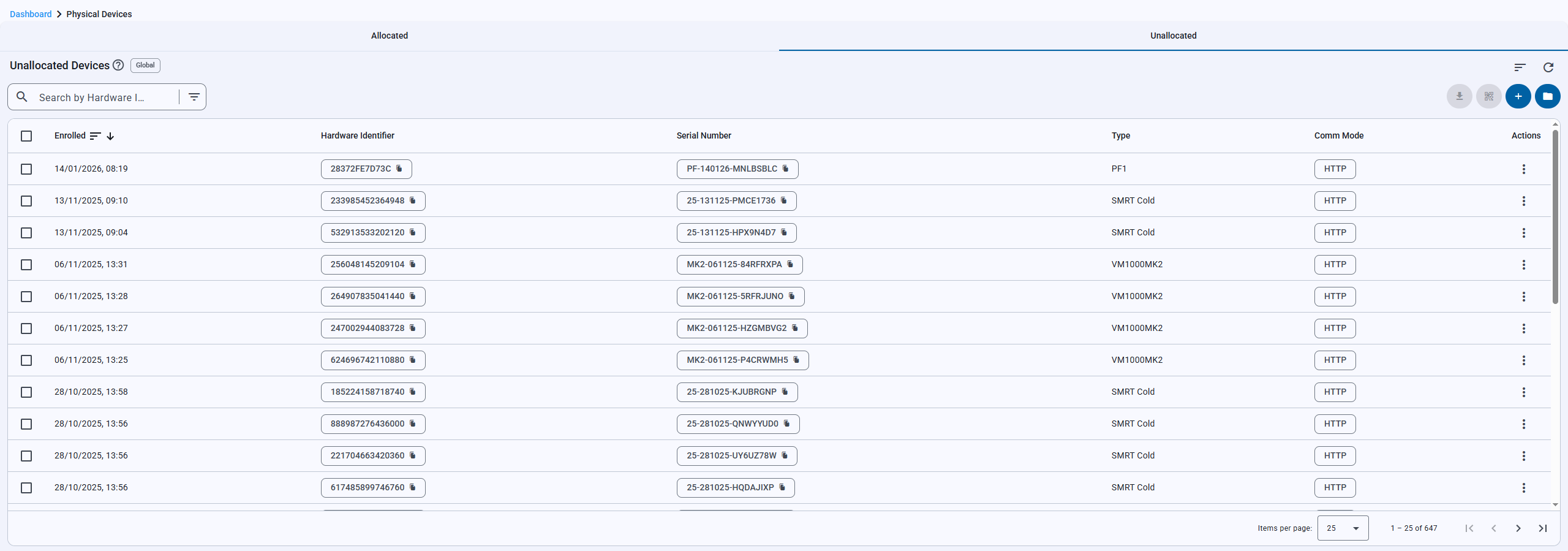 This page allows users to view, search, filter, select, and manage unallocated physical devices in the system. It is designed for operational tasks such as reviewing device details, copying identifiers, downloading certificates, viewing QR codes, and deleting devices (subject to permissions).
