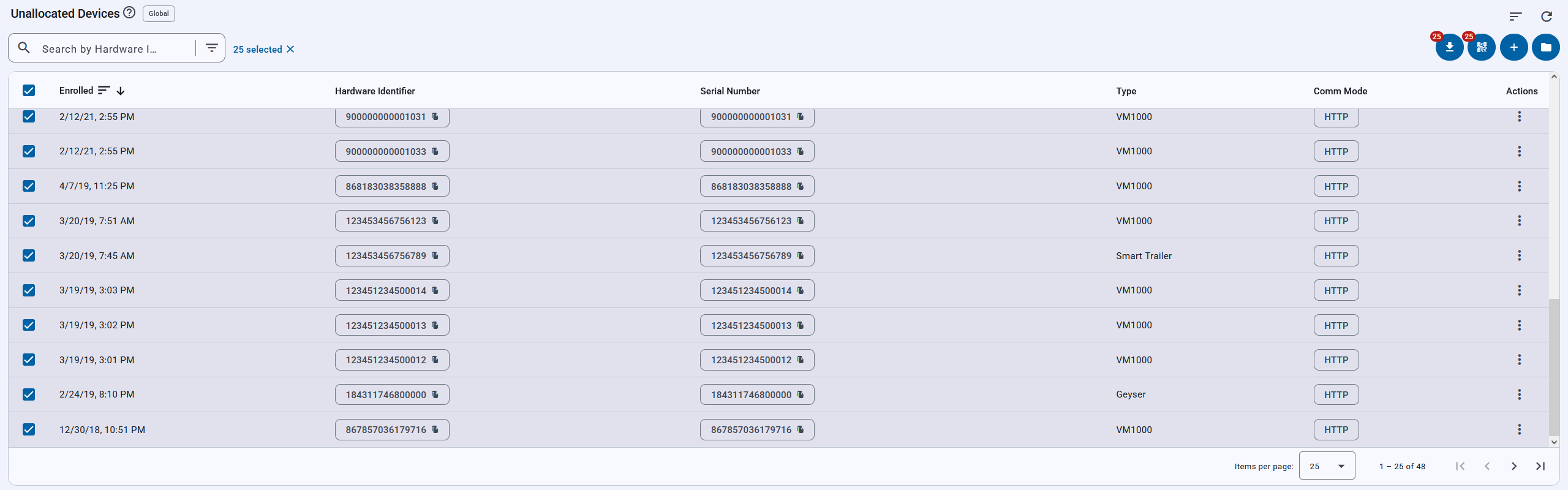 The grid displays a paginated list of unallocated devices along with their key attributes.